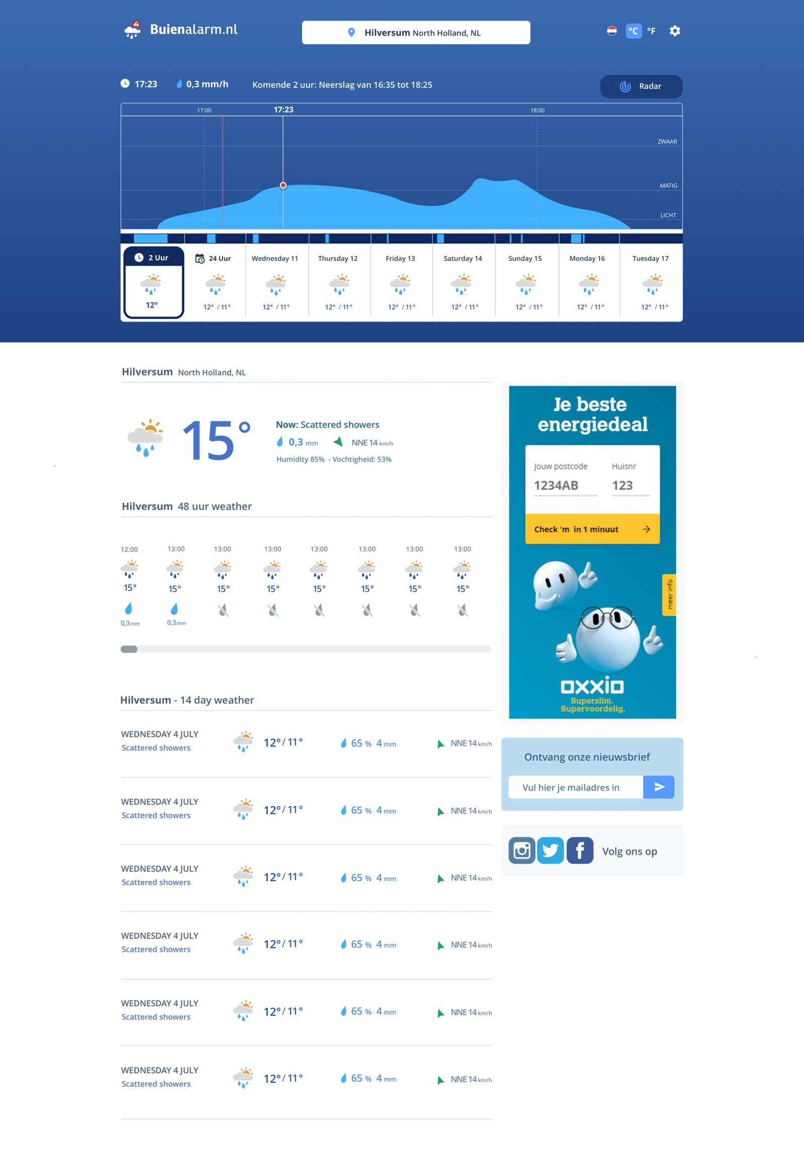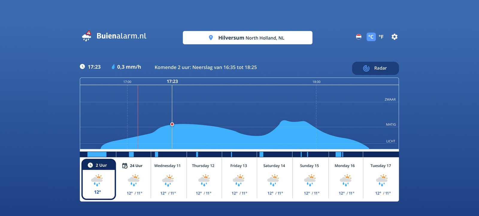Buienalarm.nl features a clean and functional design, centered around providing real-time weather information. The blue and white color palette conveys trust and calmness, while simple sans-serif typography ensures readability. The layout is intuitive, with key data like current conditions and a rainfall graph prominently displayed at the top, making navigation easy.