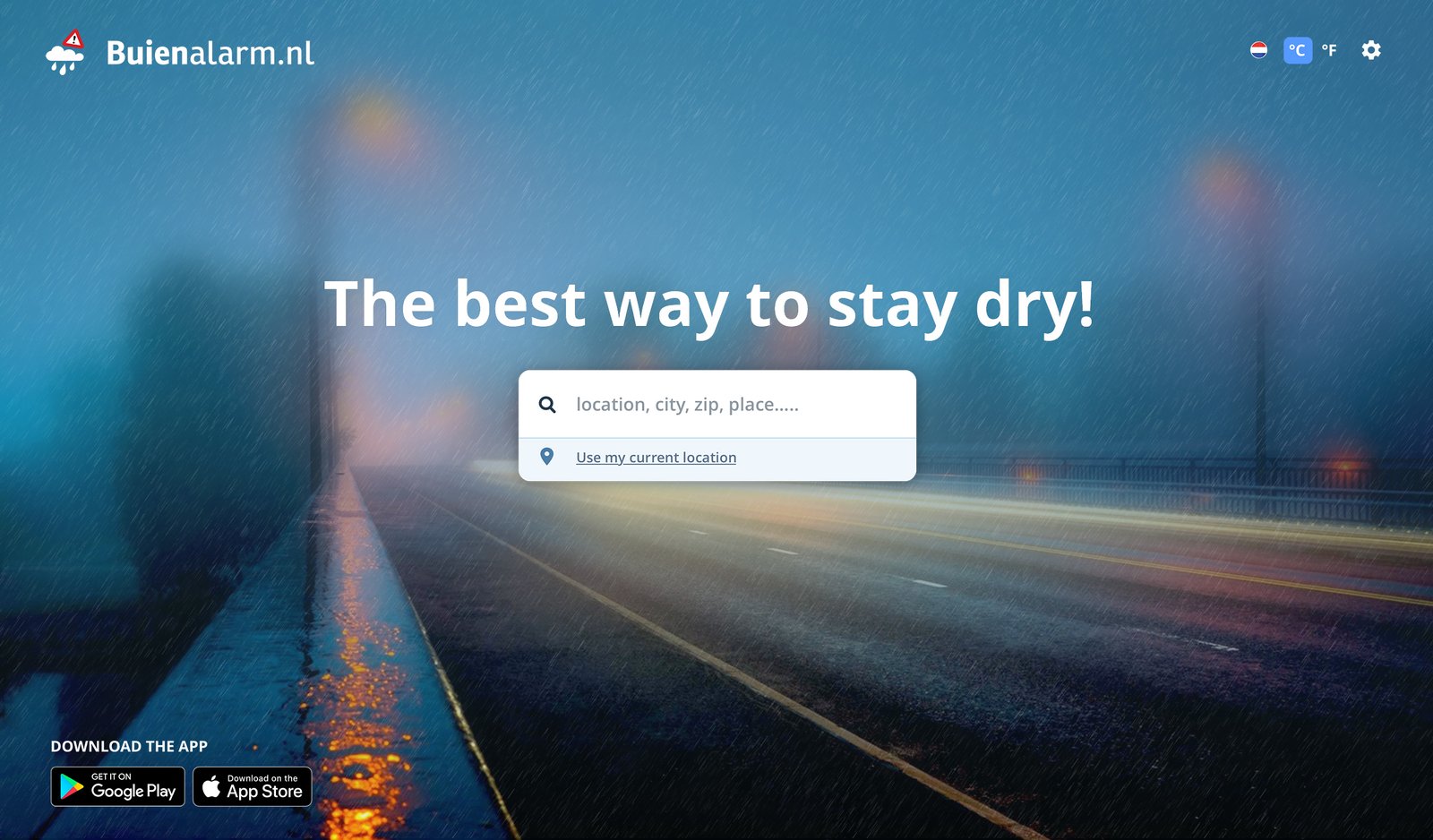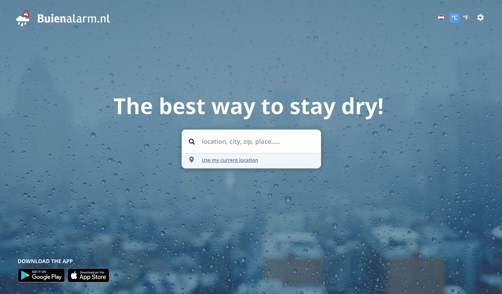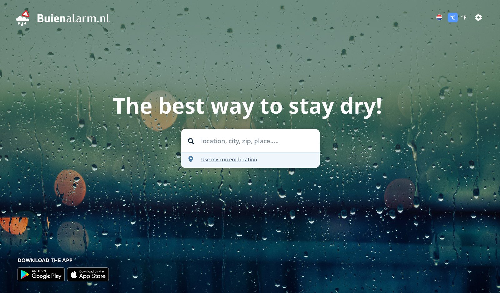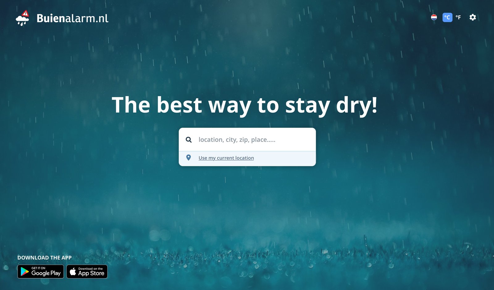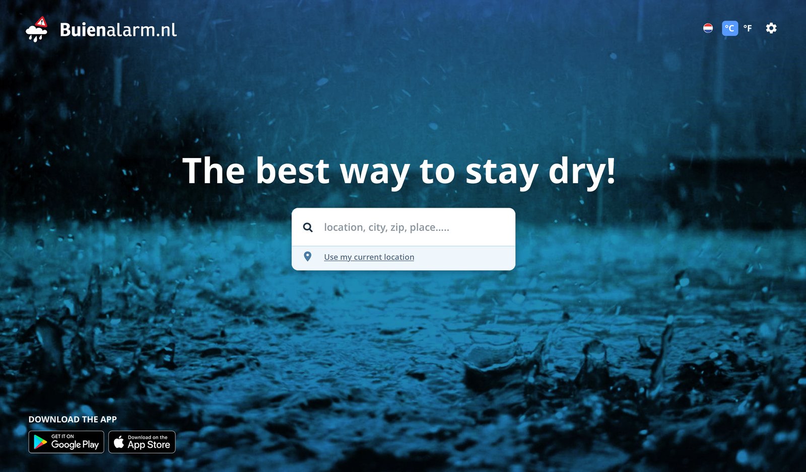 The Buienalarm homepage design is sleek and focused, with a clear, direct message: “The best way to stay dry!” The rainy, blurred backgrounds reinforce the app’s purpose of rain forecasting, creating a strong visual connection. The central search bar invites users to quickly check the weather by inputting their location or using their current one, making the experience seamless. The design emphasizes simplicity, allowing users to immediately access the app’s core feature of hyper-local rain predictions, without distractions.